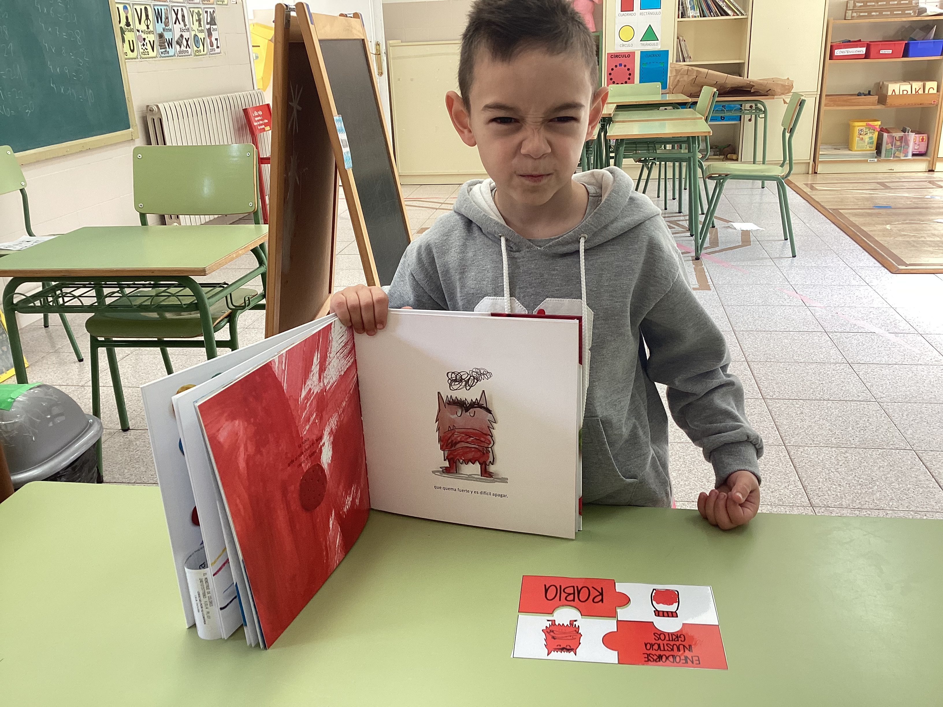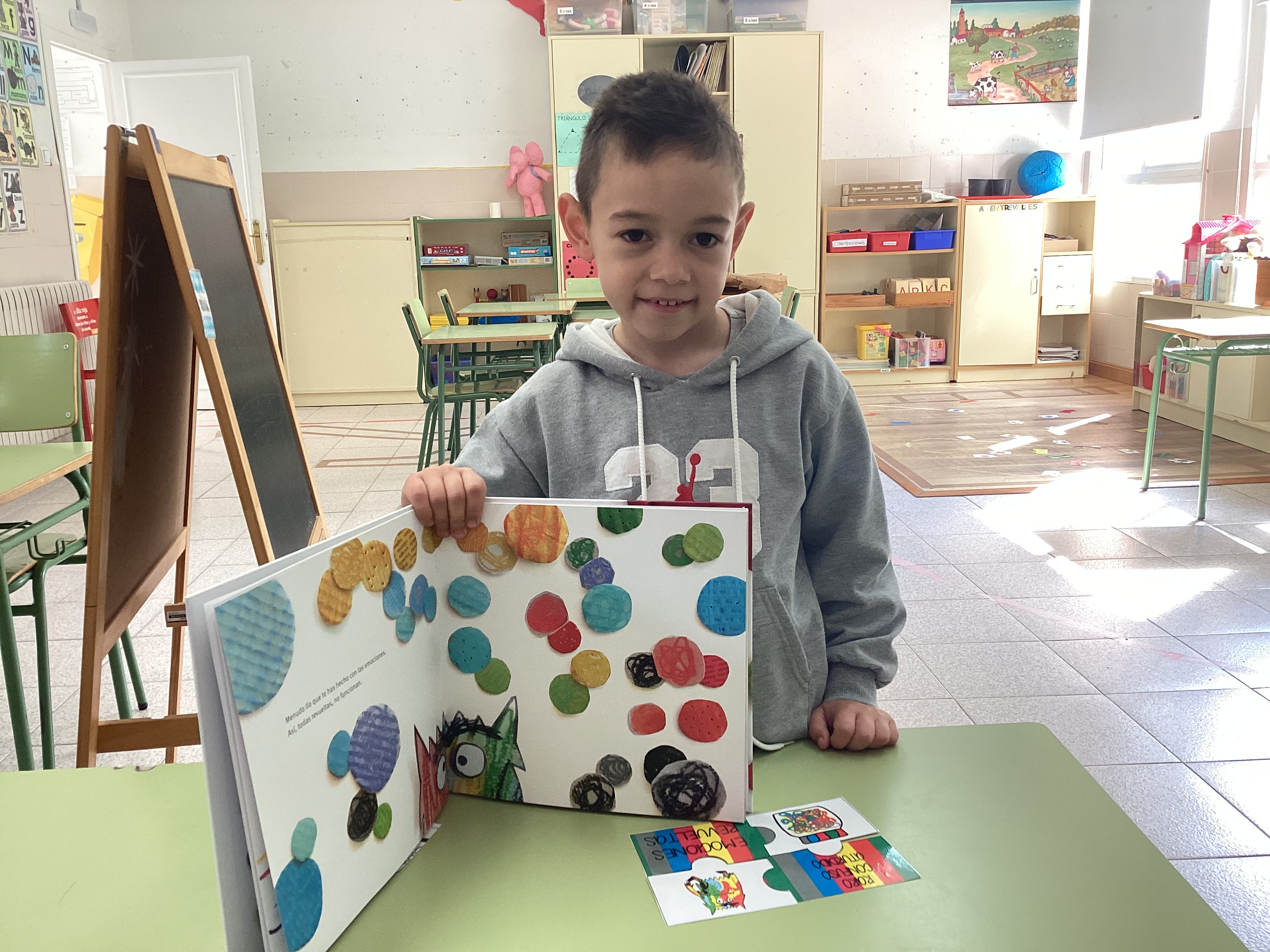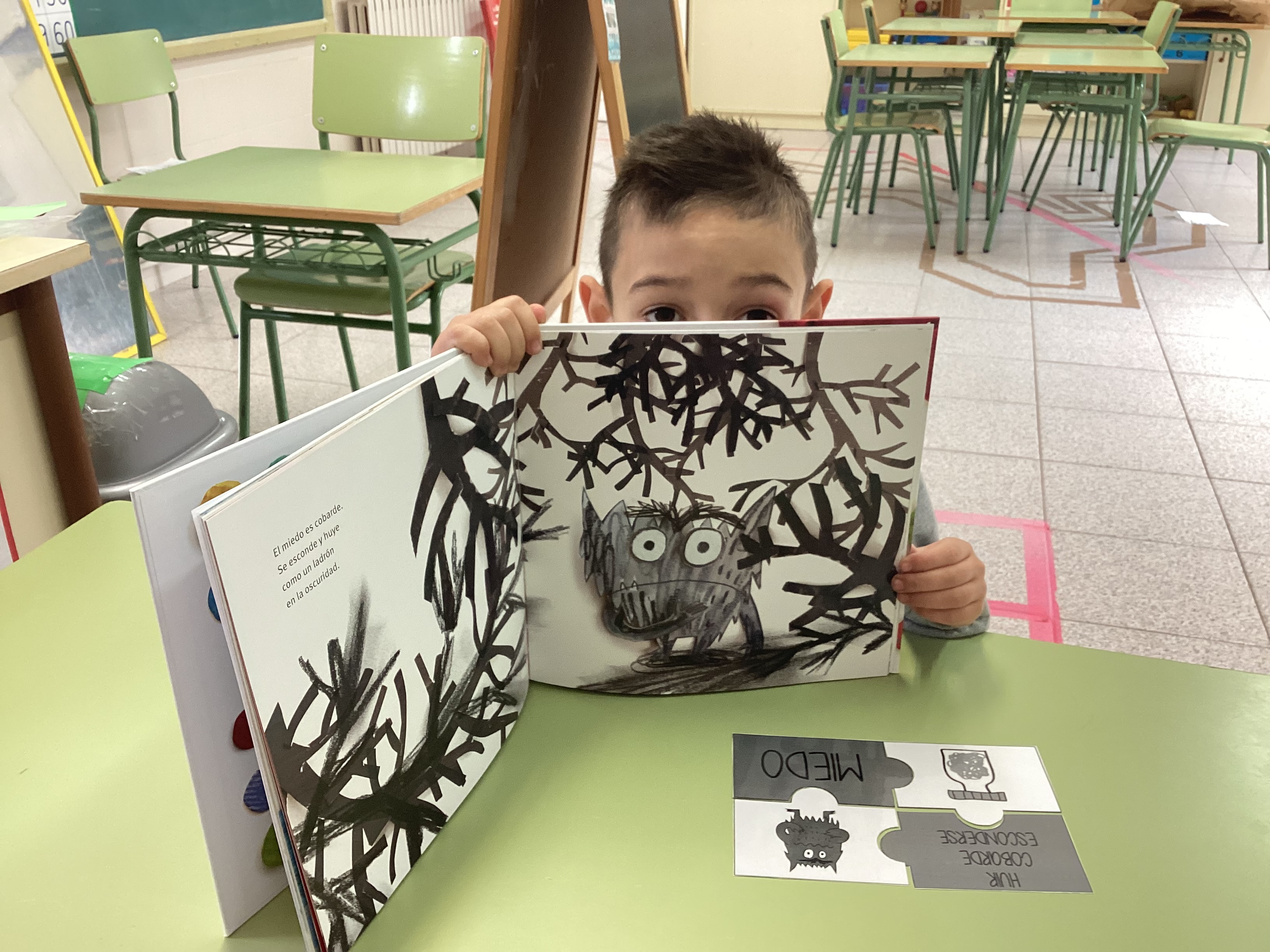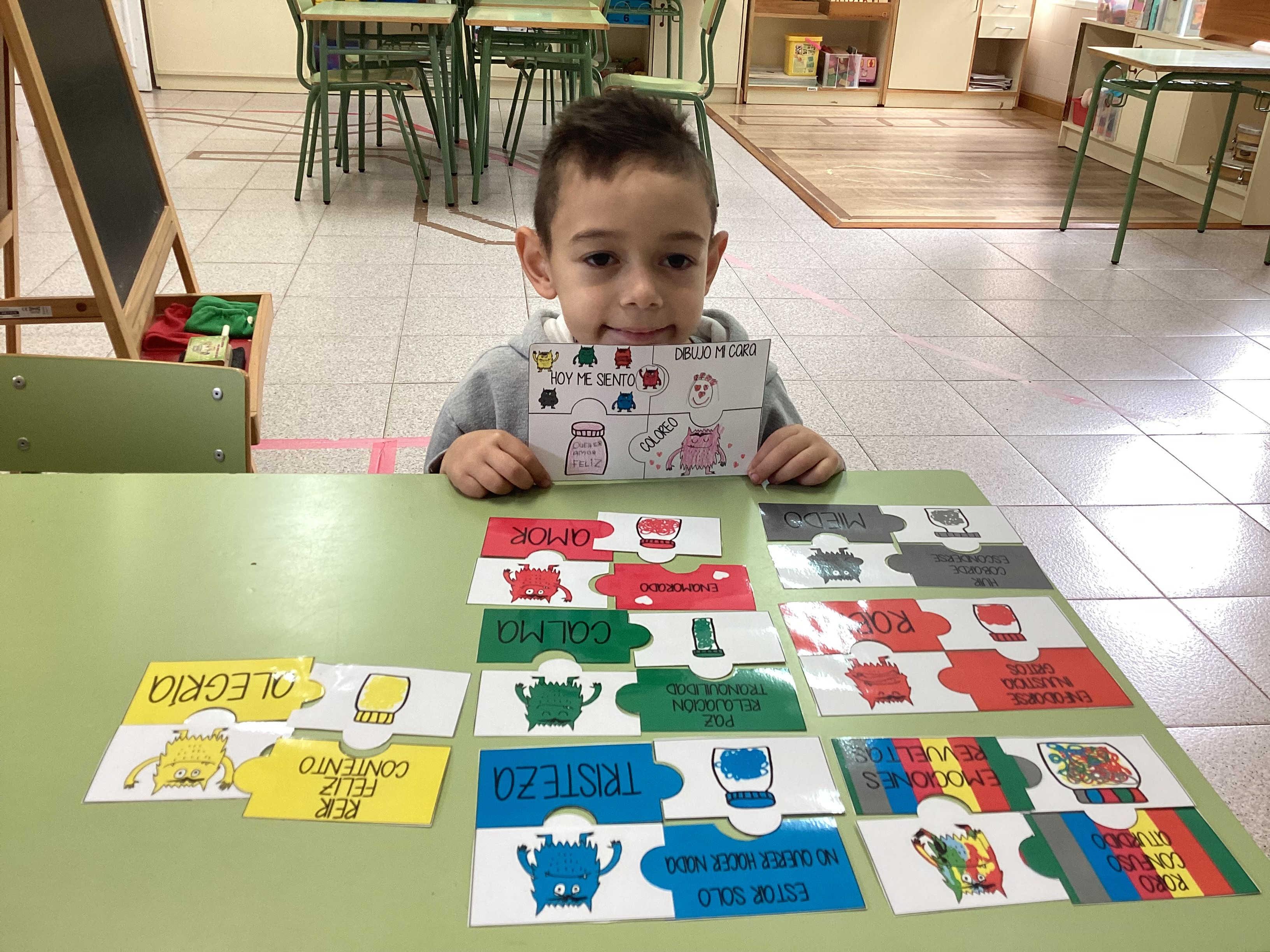 En esta ocasión, leímos primero el cuento y profundizamos en las diferentes emociones. A continuación, comenzamos a realizar el rompecabezas de cada emoción, empezamos a montar el puzzle de la emoción con la que el alumno menos se sentía identificado (explicando sus causas y compartiendo experiencias) hasta cerrar la actividad montando el rompecabezas de la emoción que sentía en ese momento, la cual representó mediante la escritura y el dibujo (como se puede ver en la última imagen).