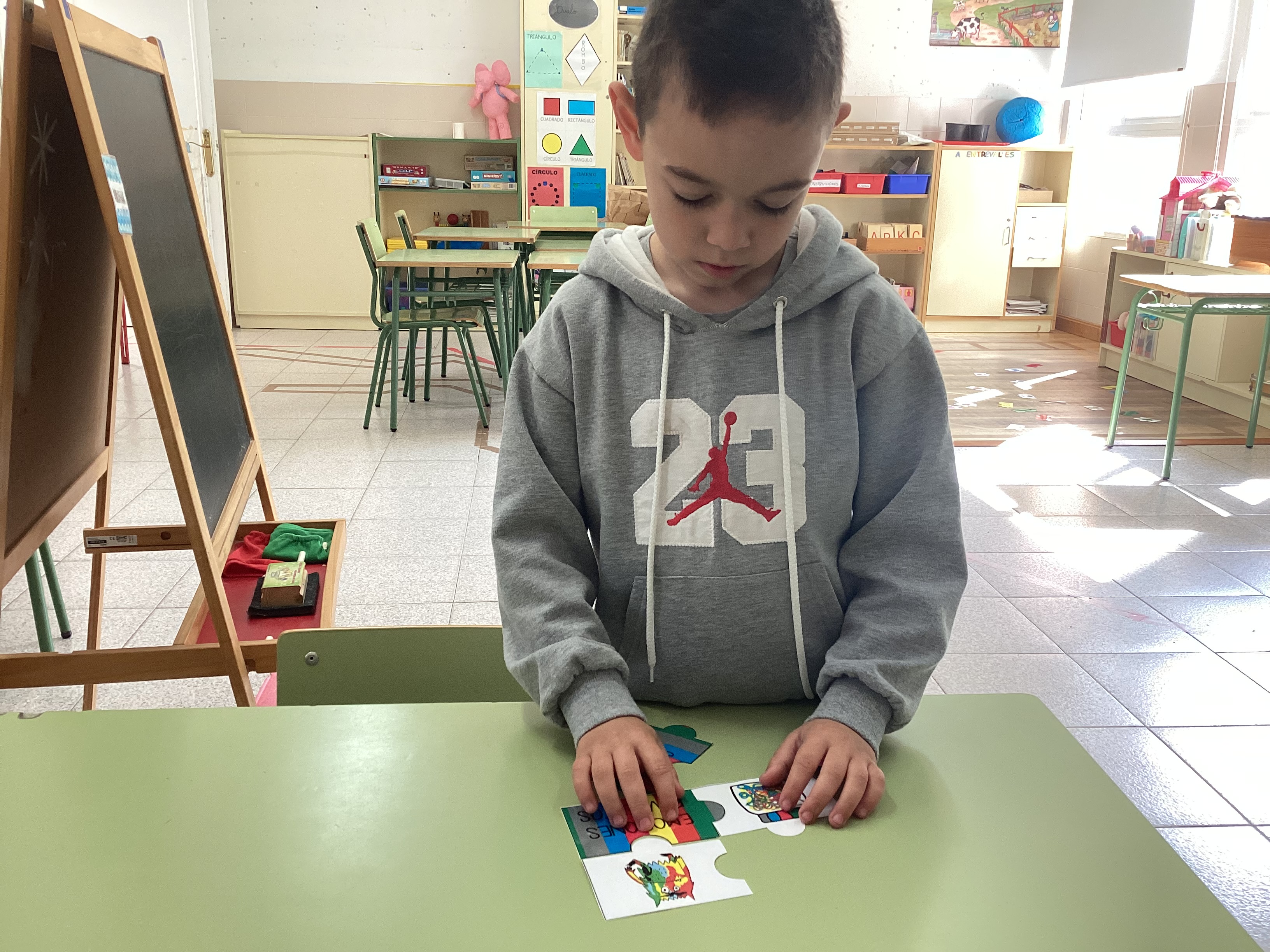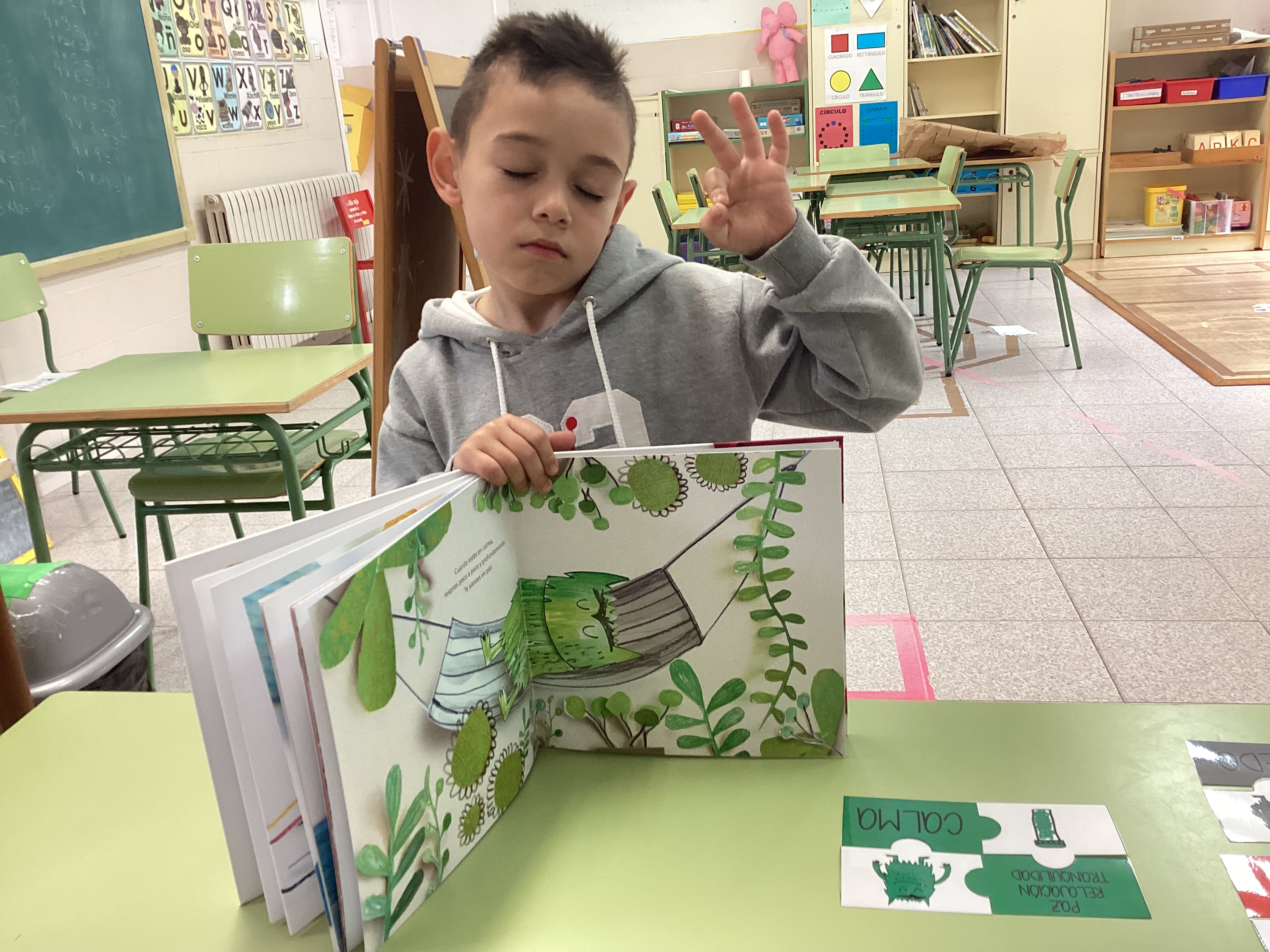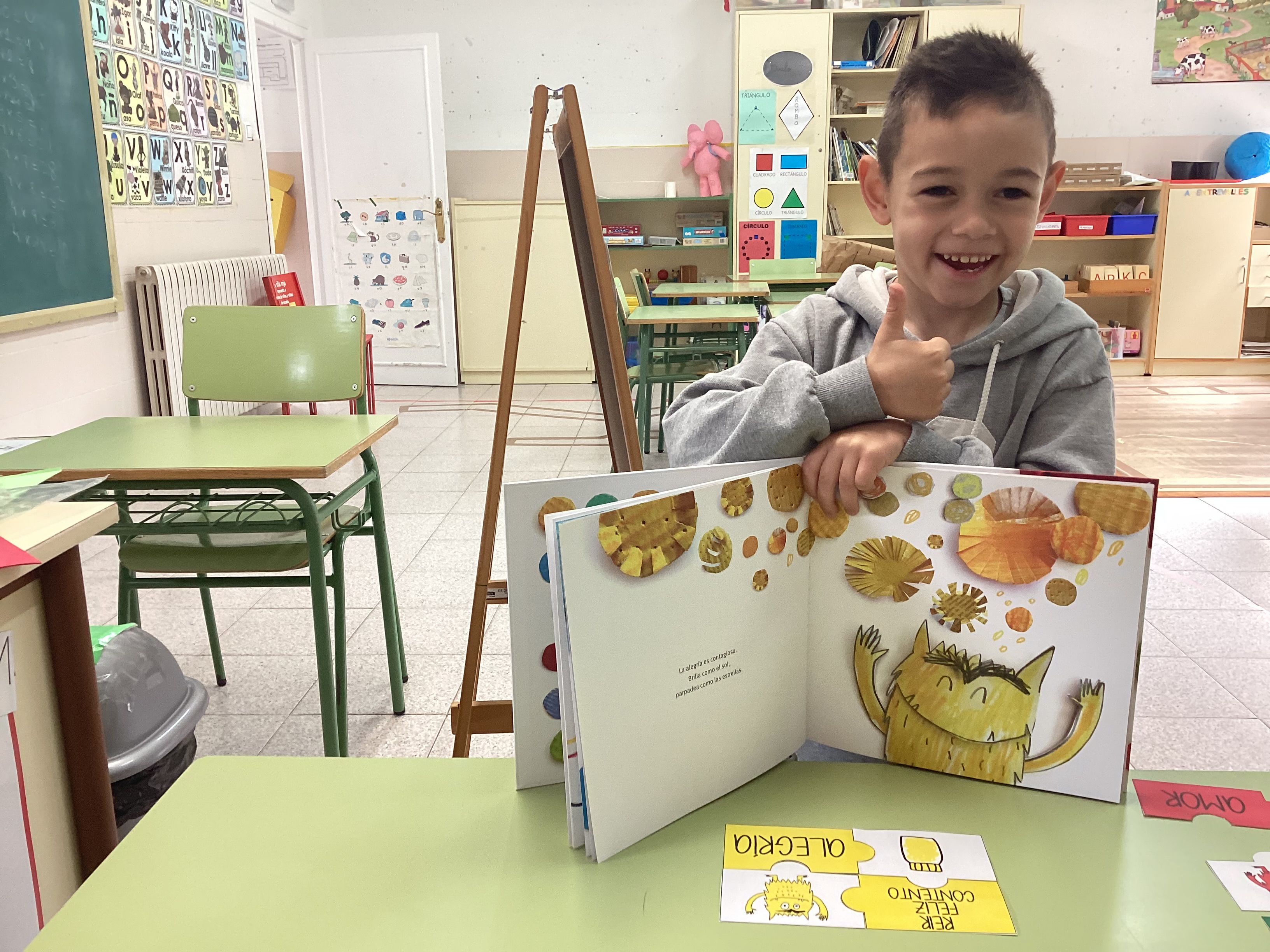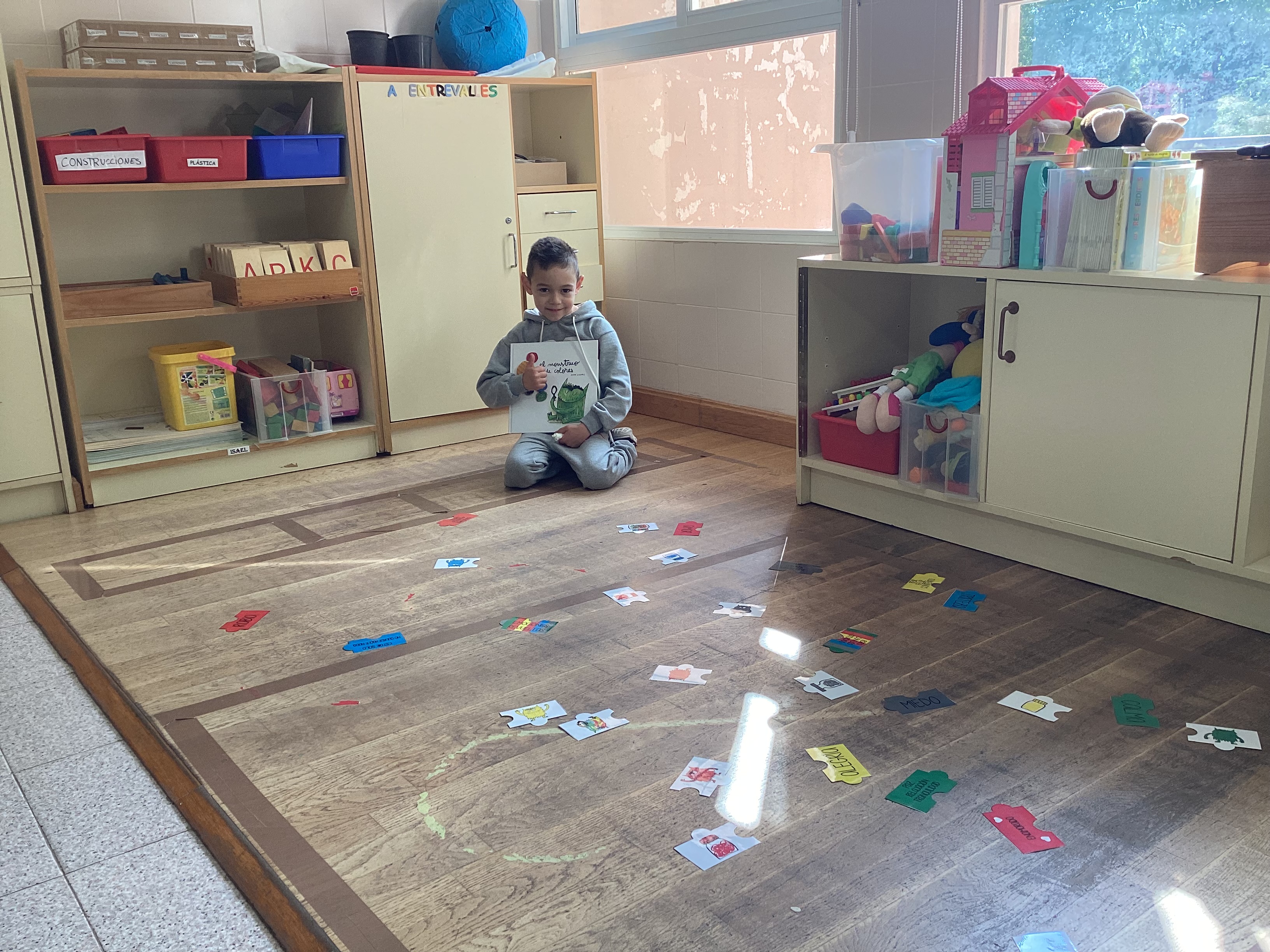 En esta ocasión, leímos primero el cuento y profundizamos en las diferentes emociones. A continuación, comenzamos a realizar el rompecabezas de cada emoción, empezamos a montar el puzzle de la emoción con la que el alumno menos se sentía identificado (explicando sus causas y compartiendo experiencias) hasta cerrar la actividad montando el rompecabezas de la emoción que sentía en ese momento, la cual representó mediante la escritura y el dibujo (como se puede ver en la última imagen).
