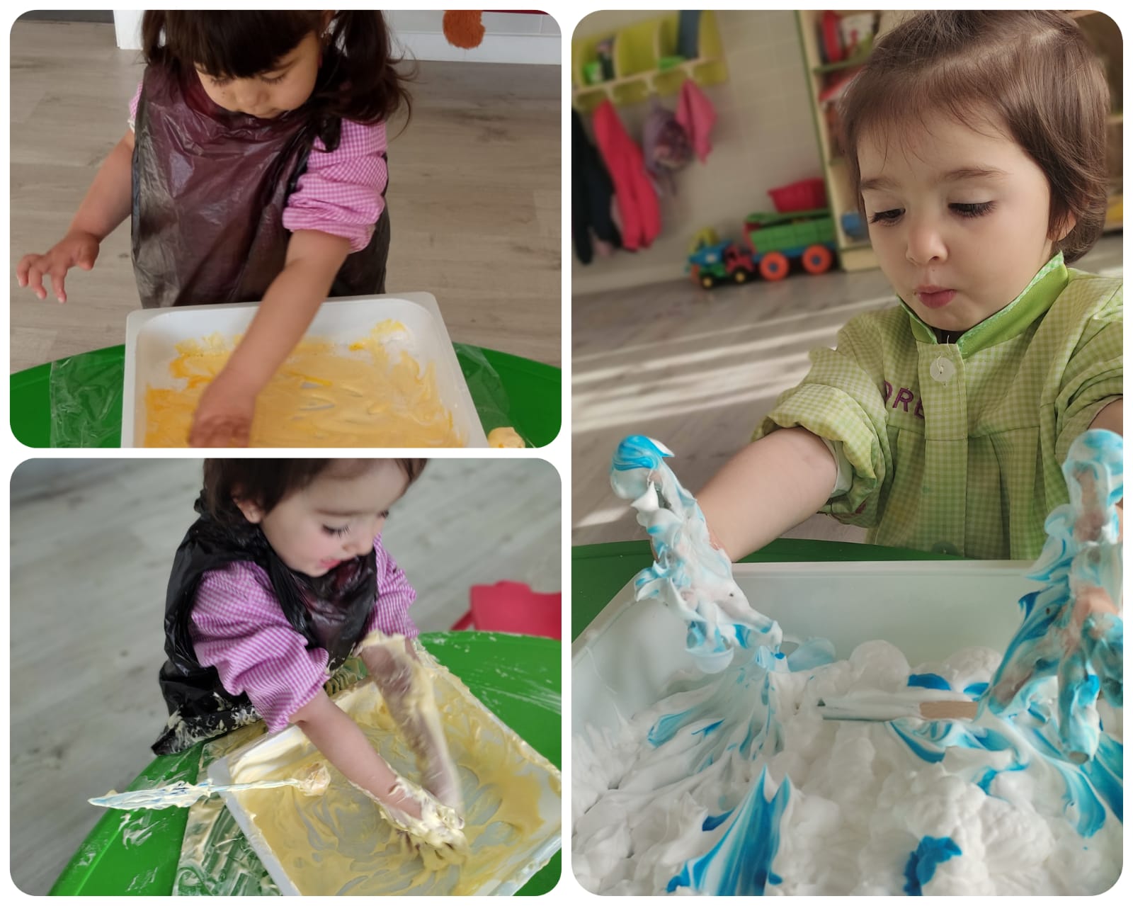 Esta vez, realizando un cuadro en nuestro rincón Cre-A-rte con cartón y témperas de colores. Tamnbién hemos experimentado diferentes texturas manipulando espuma y colorante alimenticio y con témpera de dedos plastificada; las esperiencias sensoriales han sido máximas. Aquí os dejamos unas imágenes de lo bien que nos hemos pasado.
