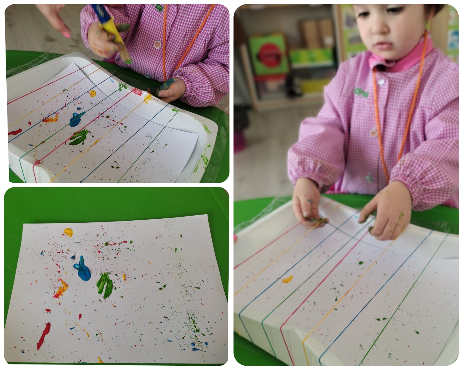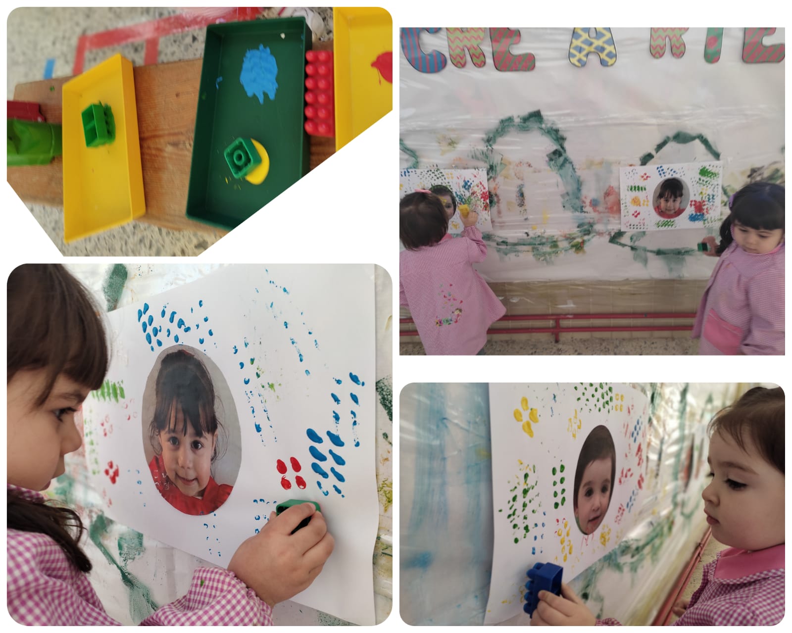 Nos encanta experimentar con diferentes texturas, así como uilizar materiales variados para dejar volar nuesta imaginación y estamparlo en nuestro rincón Cre-a-rte. En las imágenes, podréis ver: cuadros hechos estampando bloques de construcciones, a Andrea haciendo plastilina casera o decorando un folio con gomas elásticas y témpera, actividades muy divertidas. Esperamos que os gusten.