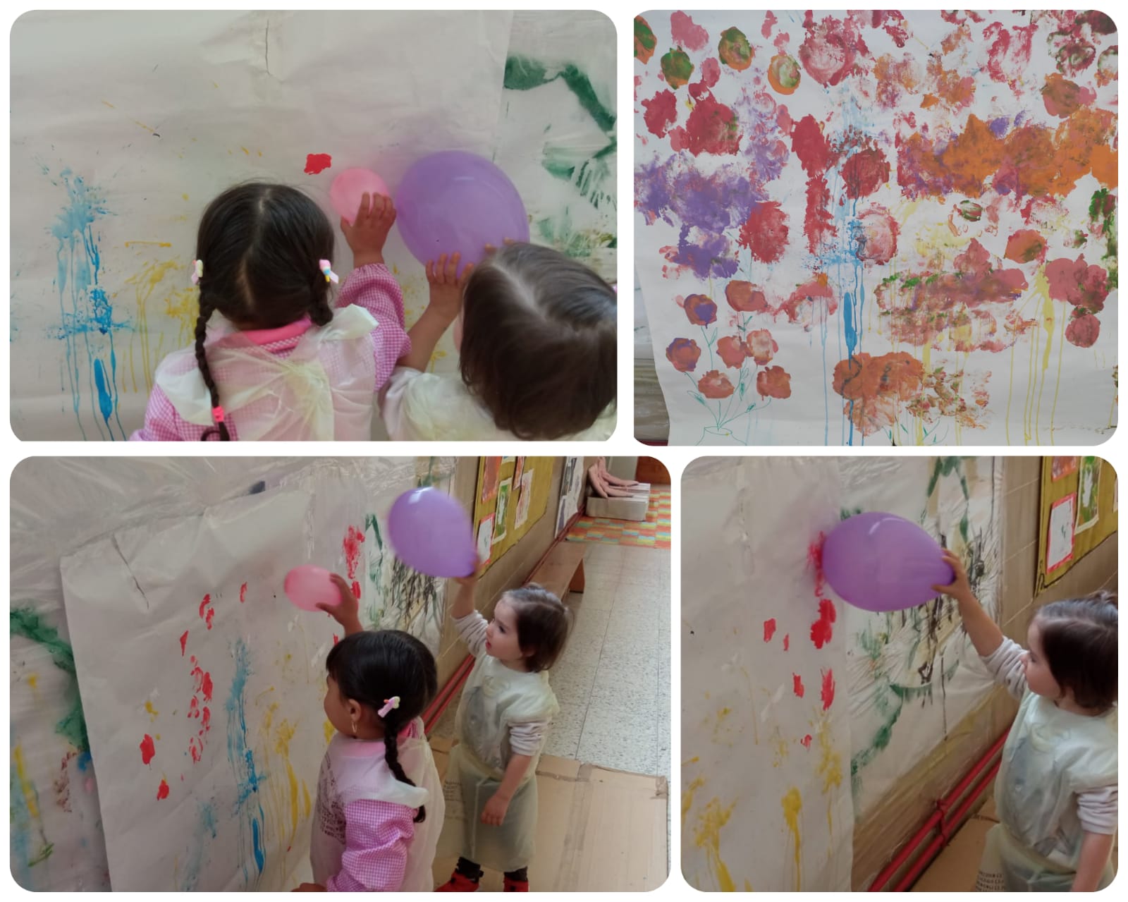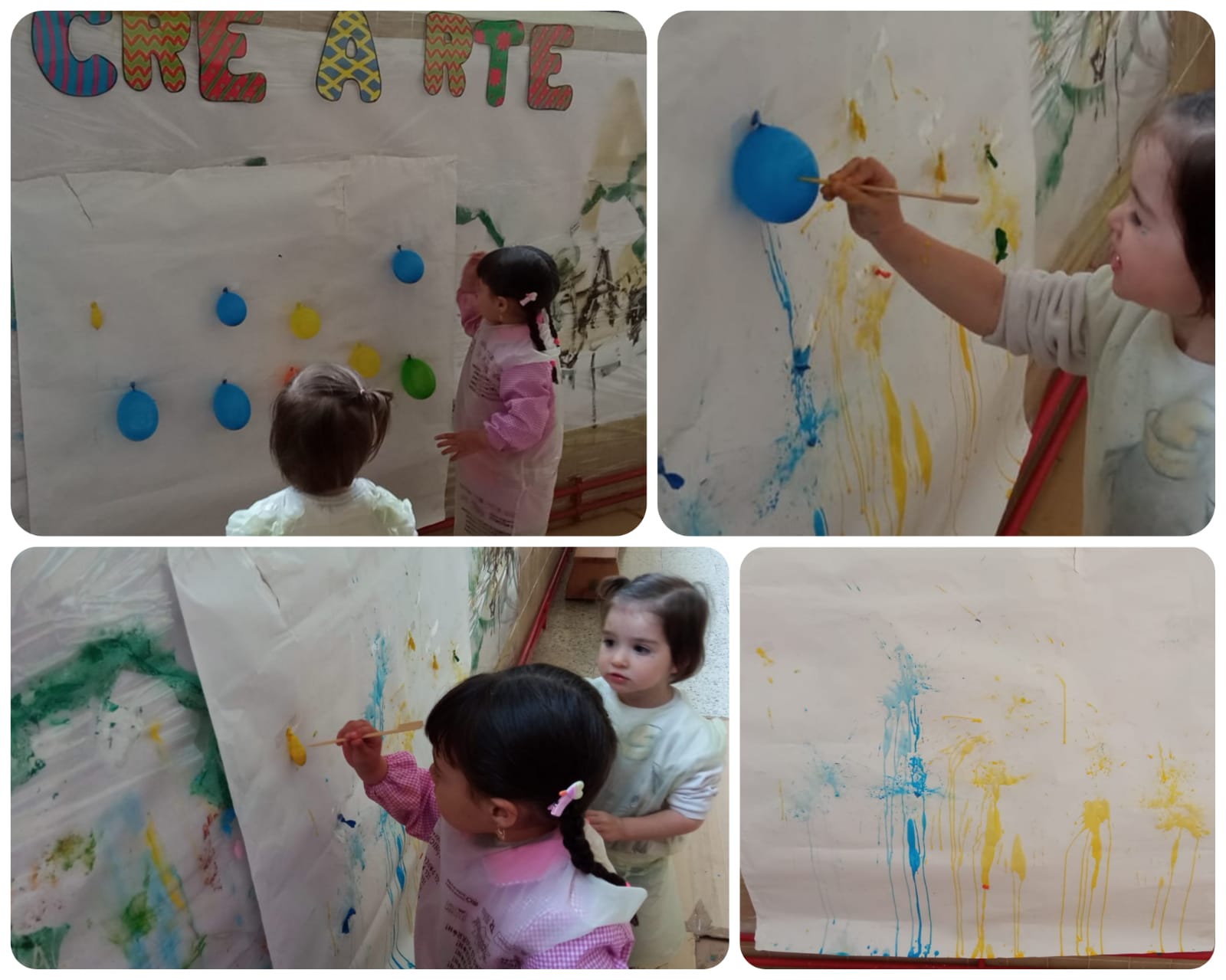 En estas fotos,podréis ver cómo hemos disfrutado usando diferentes materiales, pinchando globos llenos de pintura o estampándolos en nuestro mural Cre-a-rte. Esperamos que os gusten.