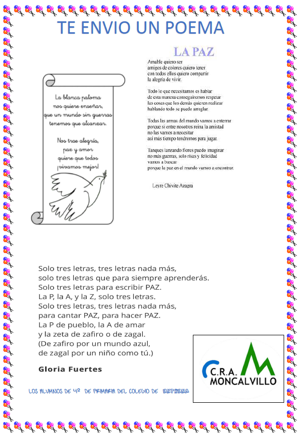 Seguimos regalando poemas en relación al Día de la Paz, esta vez los encargados han sido nuestros amigos del CRA Moncalvillo de la mano de Gloria Fuertes y Leyre Chivite Azagra. Los alumnos de Badarán han tenido la oportunidad de hacerlo en un entorno diferente, LA BIBLIOTECA.