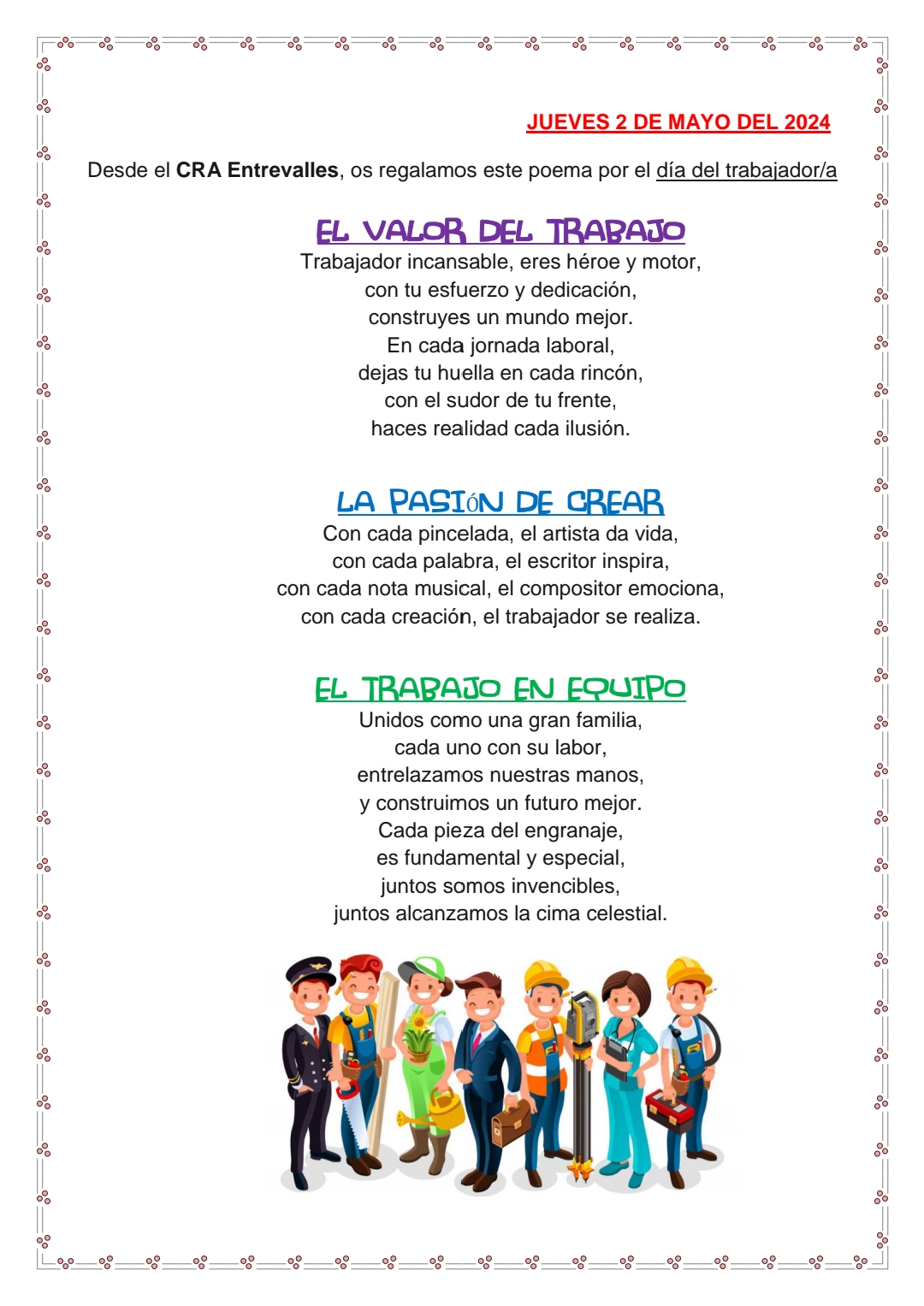 El pasado miércoles 1 de Mayo celebramos el "Día del Trabajador" con un poema especial para todos los trabajadores/as que día a día construyen el mundo con su esfuerzo y dedicación. Como siempre os dejamos con el texto y el audio del mismo. ¡Feliz día del trabajador!
