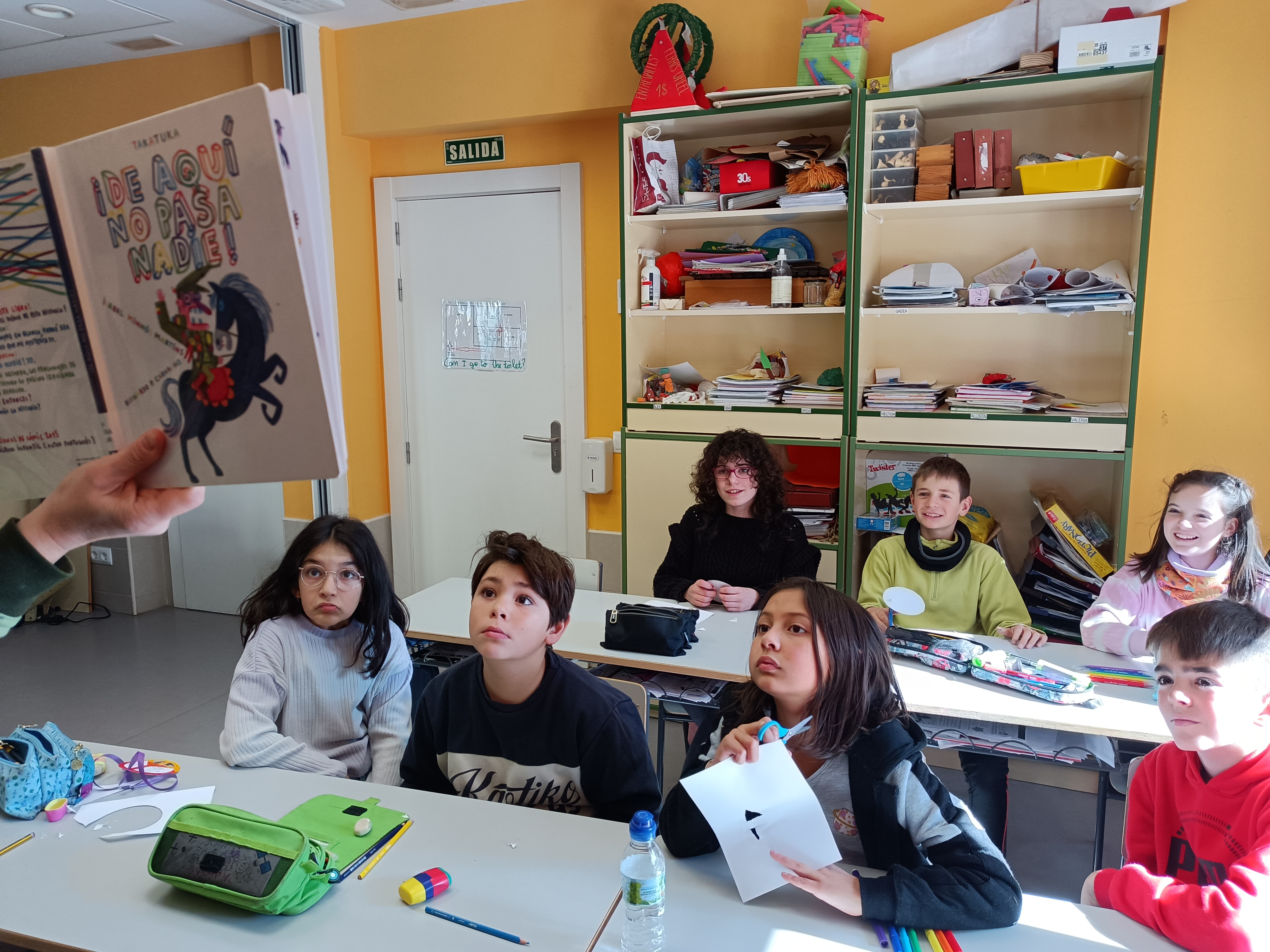 - ¡De aquí no pasa nadie! Autora Isabel Minhó Martins e ilustrador Bernardo Carvalho, Editorial Takatuka, segundo y tercer ciclo de Primaria. Un álbum que juega con el propio formato de libro en el que un general ha decidido que nadie puede pasar a la página derecha ¿Pero por qué? Un alegato contra el totalitarismo. En las guardas de este libro, a modo de presentación, aparecen los personajes que van a formar la historia de sus páginas. Los alumnos, muy observadores, pronto empezaron a sacar conclusiones del absurdo inicio de la narración.