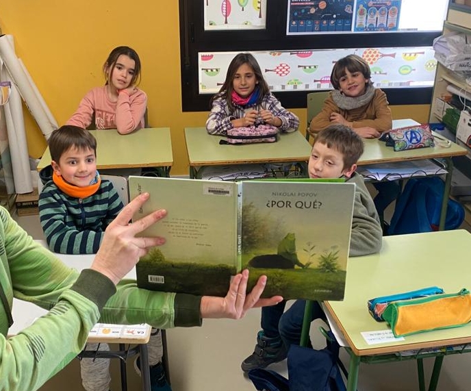 - ¿Por qué? De Nikolai Popov, Editorial Kalandraka, Infantil y primer ciclo de Primaria. Un álbum sin texto en el que descubrimos a través de las ilustraciones la sinrazón y lo absurdo de las guerras, cómo los conflictos empiezan por algo pequeño y acaban siendo terribles y devastadores. Los propios alumnos, a través de las ilustraciones, fueron quienes desarrollaron la historia y se dieron cuenta de los problemas que puede acarrear la falta de diálogo y lo poco agradable que es el conflicto.
